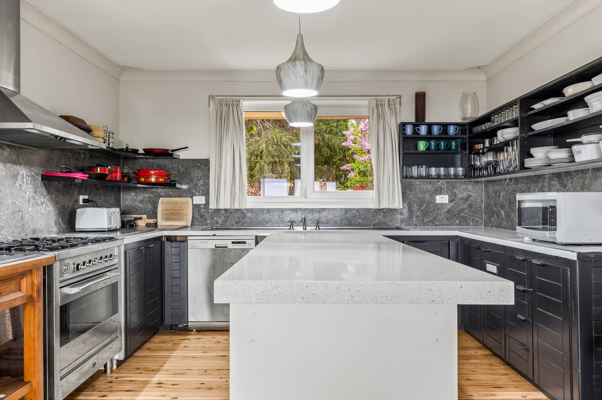 -    Large kitchen with stone island, 900mm gas stove and dishwasher