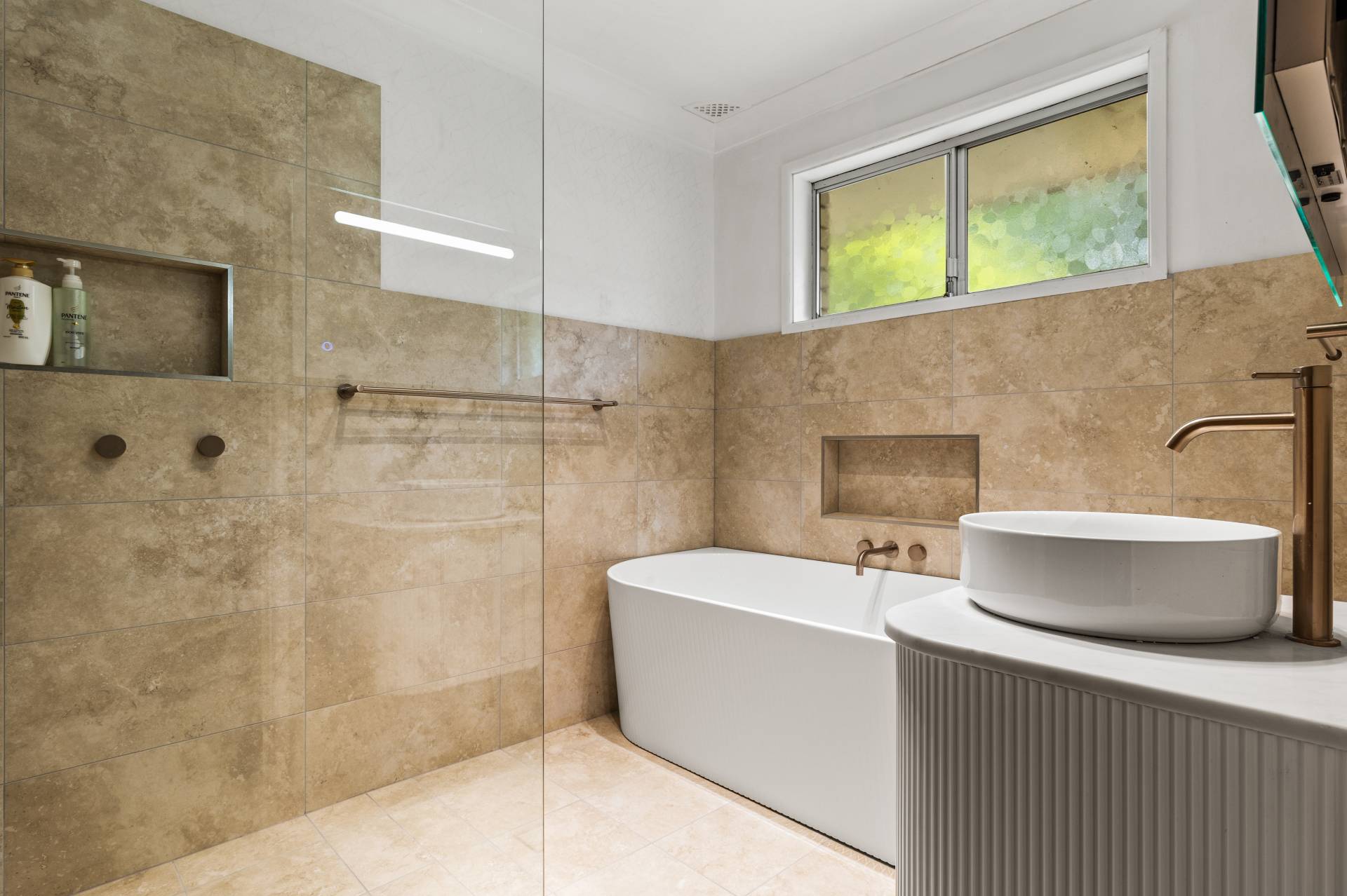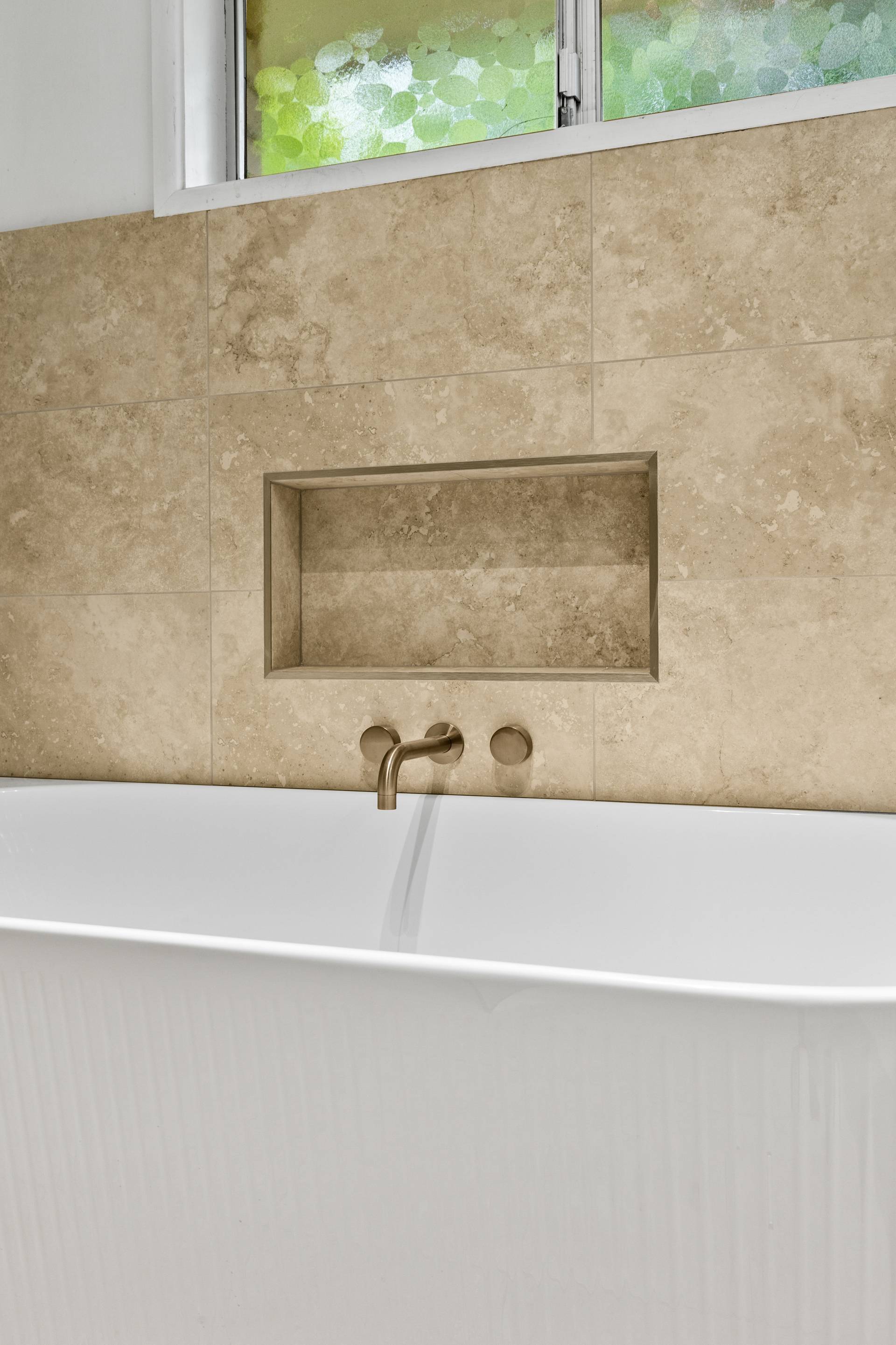 -    Stunning brand new bathroom featuring travertine tiling and LED back-lit mirror